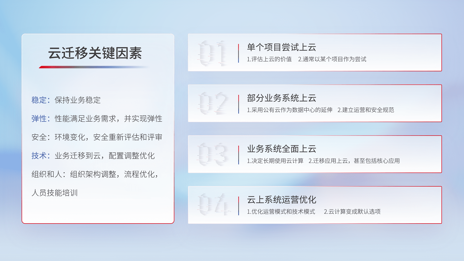 结合实际业务,,,从规划设计、、云平台选型、、、、云原生改造、、数据迁移、、集成交付,,,,迁移全过程为客户识别最佳上云路径,,做好风险识别管理,,,设计网络架构、、、、身份权限、、安全审计合规、、、操作审计、、、、日志审计、、监控告警策略、、、、多站点容灾设计等,,对云上基础设施进行整体规划,,,,提升IT治理水平,,,,以满足弹性、、、高可用、、、高性能的需求。。。。